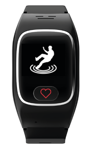Wird ein möglicher Sturz erkannt, erscheint auf dem Uhrenbildschirm ein Sturz-Symbol bzw. eine Figur / eine Person mit Kreislinien auf dem Display. Zudem vibriert die Uhr und es ertönt ein akustisches Signal.