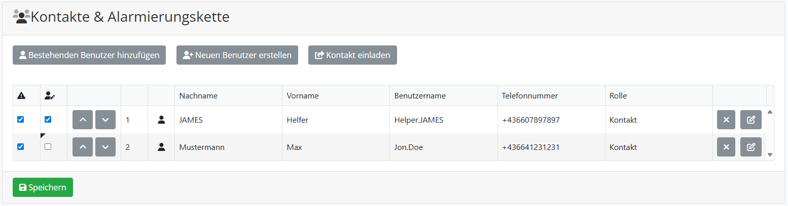 Hier können Sie neue Kontakte zu Ihrer Alarmierungskette hinzufügen, bestehende Kontakte bearbeiten oder die Reihenfolge der Notrufkontakte anpassen.